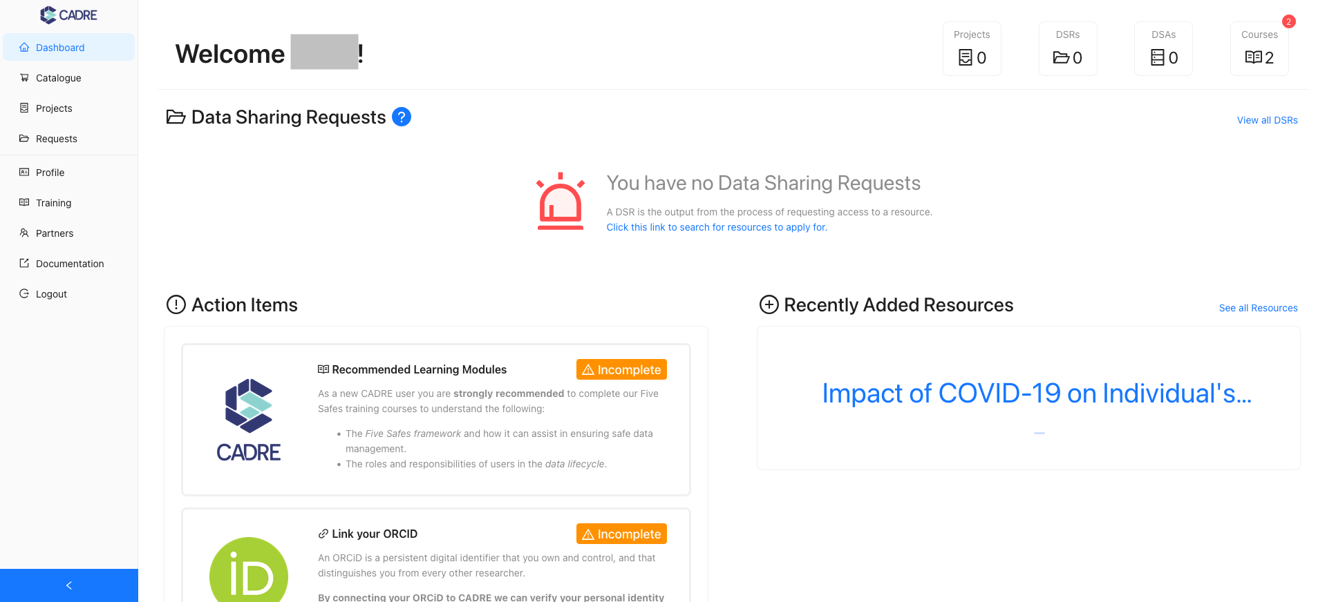 Once you have successfully authenticated yourself, CADRE will recognise these credentials to build you a profile and space within the platform.